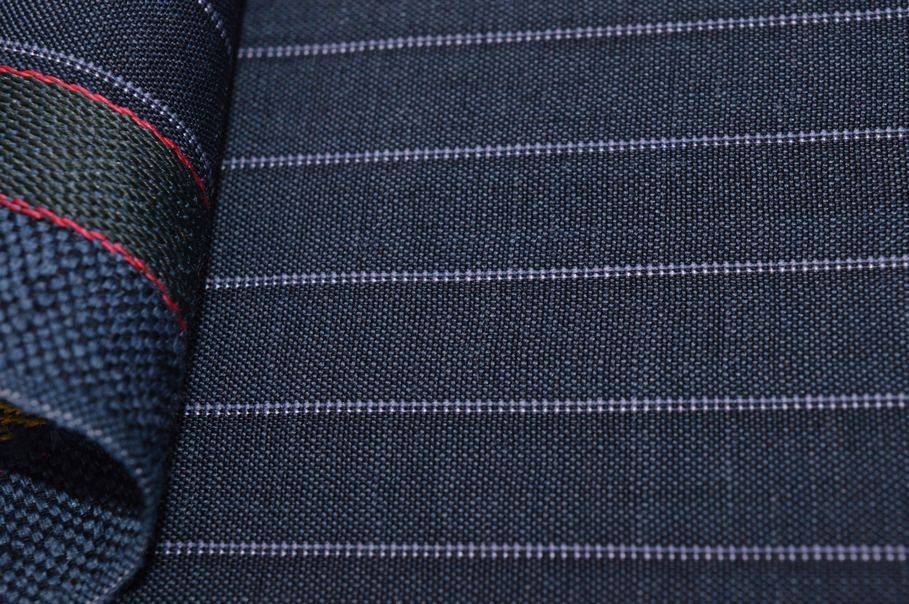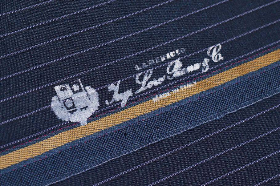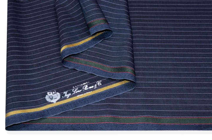 Tessuto in pura lana Tasmania firmato Lanificio Loro Piana, caratterizzato da una mano morbida, estremamente pettinata e liscia, caratteristiche ideali per capi di alta sartoria.