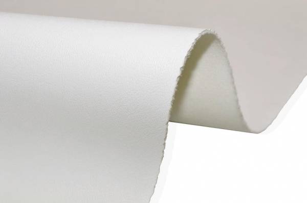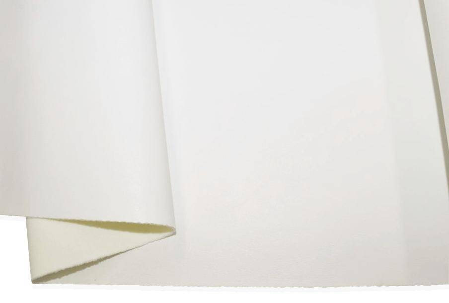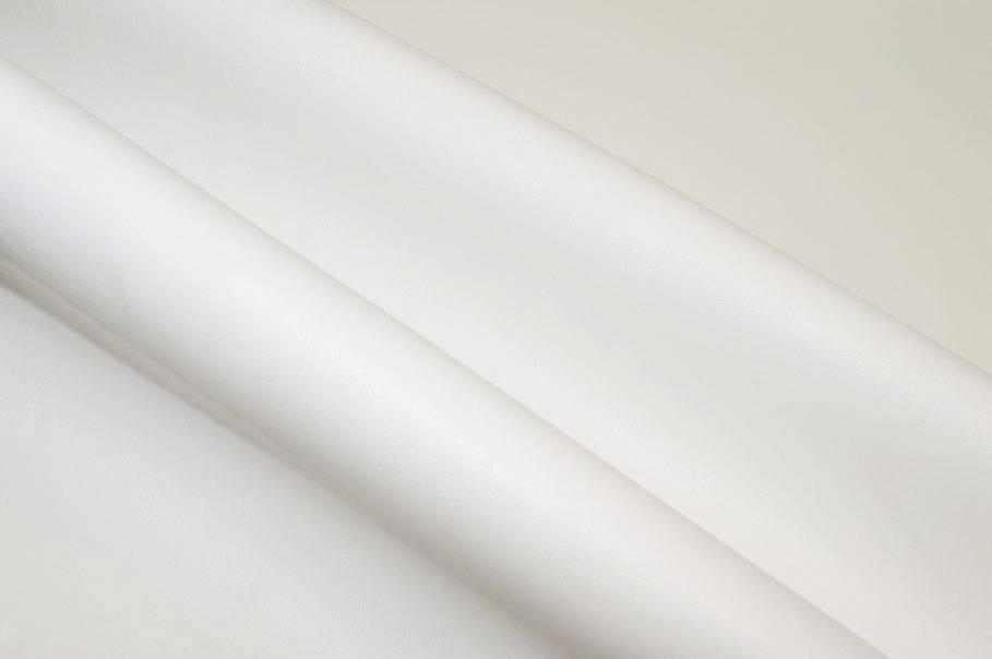 Ecopelle da arredo color bianco, caratterizzata da una struttura pesante e consistente. Al tatto risulta compatta e abbastanza rigida.