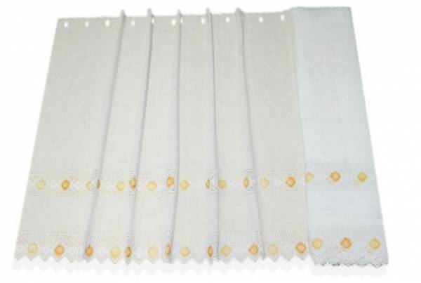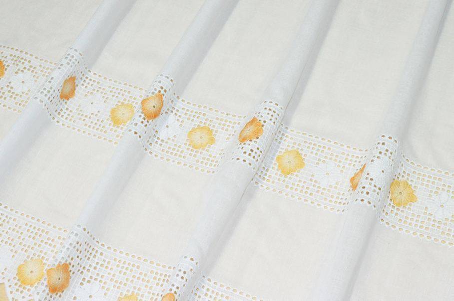 Tendino a vetro di colore bianco naturale decorato da graziosi incassi in pizzo con fiori gialli. La base presenta una leggera trama misto lino dalla mano leggera, semicoprente e filtrante alla luce. Nella zona superiore della tenda ci sono degli occhielli dove si inseriscono le apposite astine per tendini a vetro (sia a molla che con ganci). Smerlato sul fondo. Necessita di cucitura soltanto ai lati dove viene effettuato il taglio.