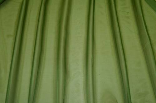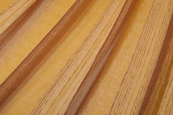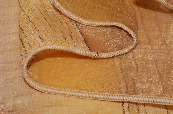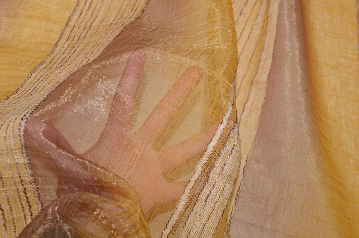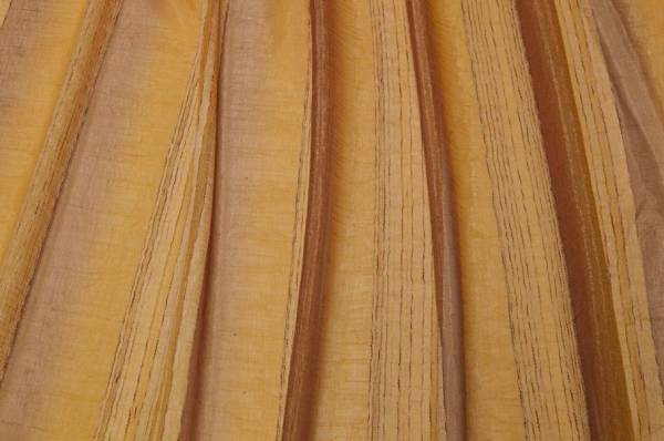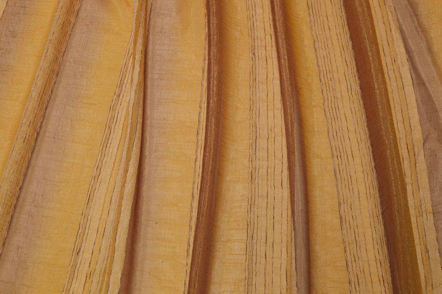 Tessuto in organza fasciata, leggero e trasparente, caratterizzato da un’alternanza di bande con diversa trasparenza. Le fasce più leggere e quelle leggermente più coprenti creano variazioni di intensità del colore ocra, generando un effetto cromatico molto gradevole.