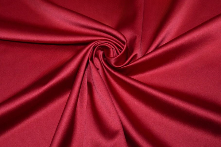 Tessuto rasatello stretch in colore rosso rubino, caratterizzato da una superficie liscia e lucente.