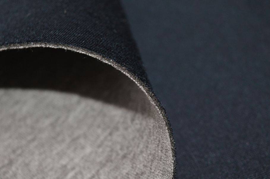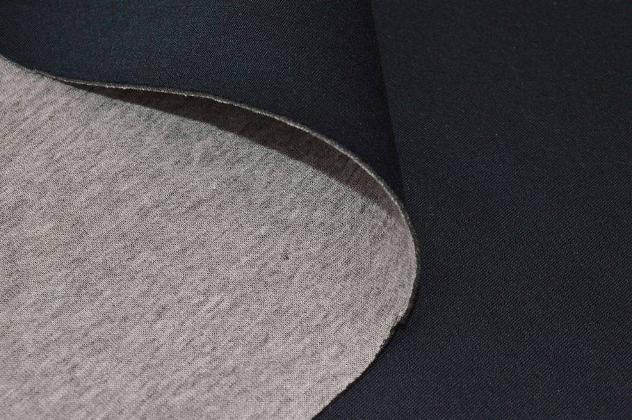 Tessuto tecnico di neoprene double in viscosa composto da un lato blu e da uno grigio con sottile gommapiuma centrale. Di struttura sostenuta è un prodotto idoneo per realizzare giubbini ed abbigliamento sportivo.