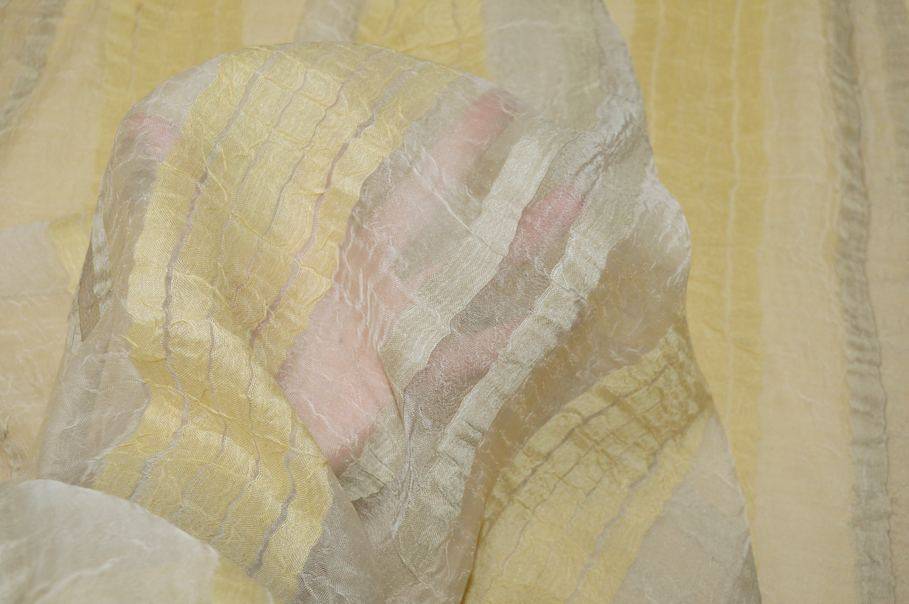 Tessuto in organza con effetto leggermente stropicciato, studiato per la confezione di tendaggi. Leggero e trasparente, presenta una caduta morbida che lo rende adatto in particolare a tende arricciate.