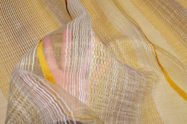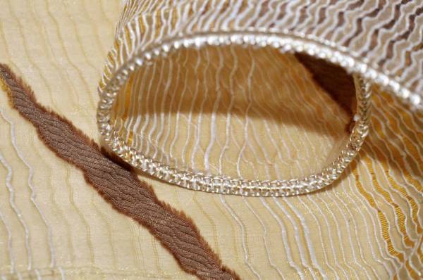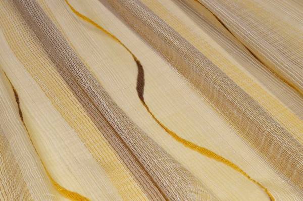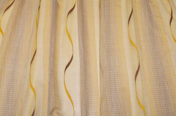 Tessuto in organza per tendaggi, caratterizzato da una lavorazione a fasce che alterna parti trasparenti a bande leggermente coprenti. Il motivo ondulato unisce tonalità ocra e marrone, creando un effetto caldo e naturale. Questa struttura permette alla luce di filtrare in modo naturale, creando allo stesso tempo un buon equilibrio tra luminosità e privacy.
