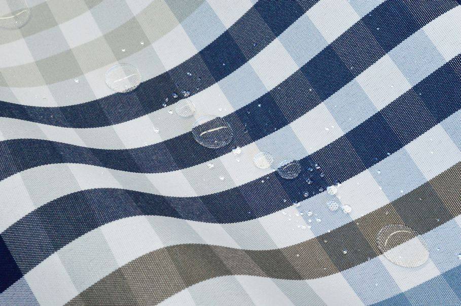tessuto poliestere/acrilico in altezza 140 cm, peso 250 gr al MTL,  con trattamento repellente al teflon che lo rende impermeabile e resistente alle macchie d'olio di sugo di vino ed a  qualsiasi altra macchia di natura grassa ed oleosa, si consiglia di pulire con un panno umido e di lavare periodicamente a massimo 30°