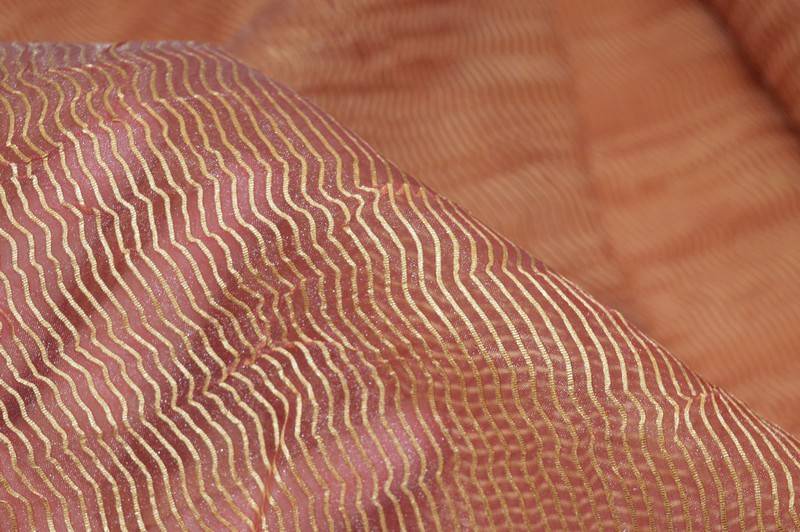 Organza  luminosa ,stropicciata, cangiante e leggera ma dalla mano sostenuta,rifinita con piombo, idoneo per la realizzazione di tende arricciate ,allestimenti ed addobbi , utilizzata anche per  abbigliamento e stole coprispalle. righine oro distanti 3 MM l'una dall'altra