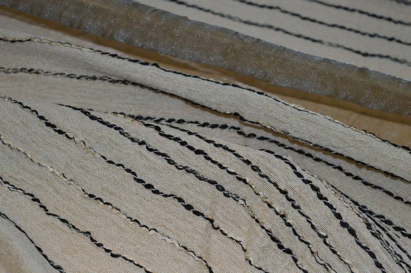Tessuto con inserti di organza larghi cm 12 e fascia beige coprente larga cm 30, idoneo per tende arricciate e a vetro. Lavabile 30°. No stiro
