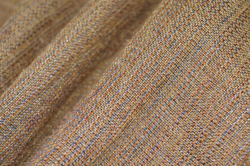 Tessuto tenda misto lino fondo beige e fili in trama colorati che le rendono un effetto melange. tessuto morbido e abbastanza coprente idoneo per qualsiasi tipo di tenda arricciata ed allestimenti vari, ma ha la struttura per confezionare anche tende a pacchetto o pannelli