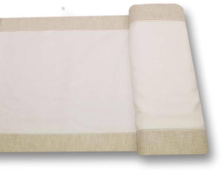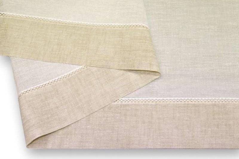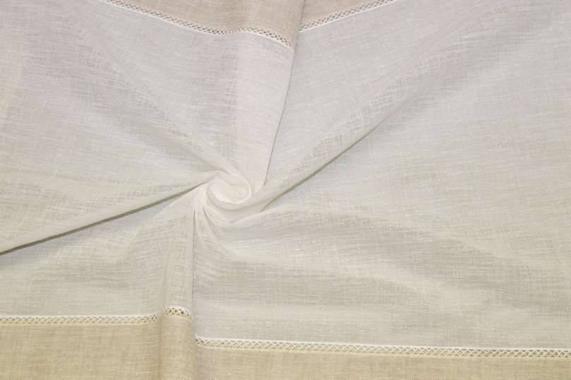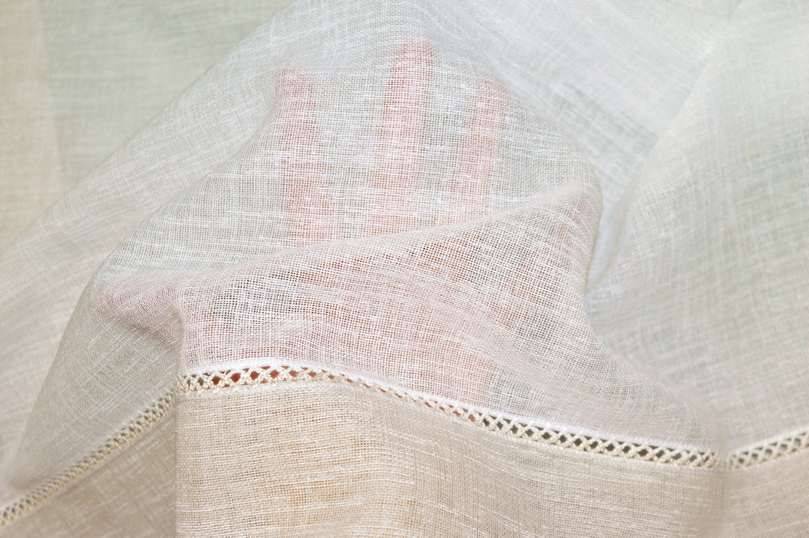 Tessuto medio leggero, con trama effetto lino leggermente filtrante alla luce con bordi laterali da cm 8. Fondo naturale (non bianco ottico, non panna) e bordi color sabbia con orlo a giorno. Da confezionare facendo orli nel lato superiore ed in quello inferiore.