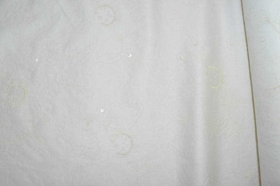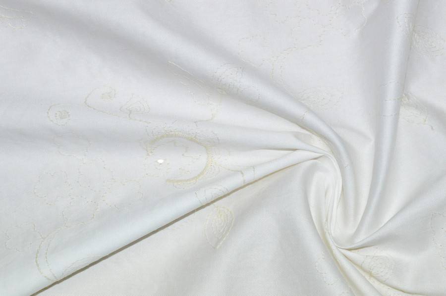 Tessuto fondo cotone leggermente elasticizzato ,ricamato con filo ecrù a campo pieno,presenta inserti di piccole paillettes trasparenti che donano un leggero punto luce.