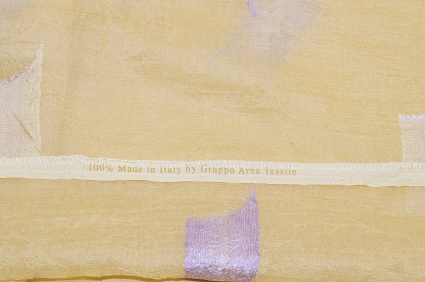 Tessuto dal fondo beige/oro dal finish trasparente e leggero. Appare stropicciato con ricami geometrici fil loupe lilla, ideale per realizzare qualsiasi tipologia di tenda.