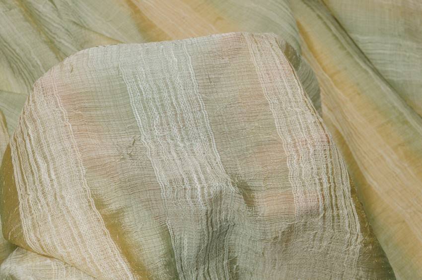 Tessuto stropicciato dalla mano trasparente e leggera. Presenta delle sfumature verde/beige, idoneo per realizzare qualsiasi tipologia di tenda.