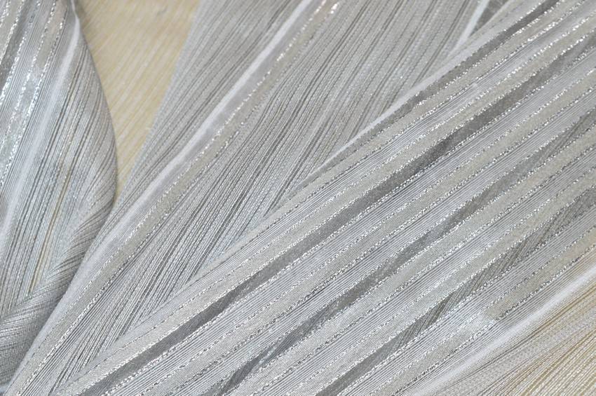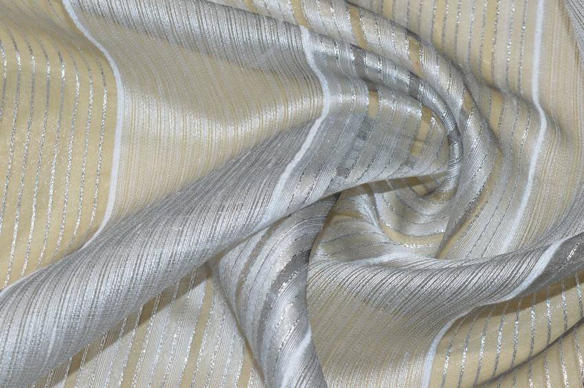 Tessuto dal fondo in organza dal finish trasparente e leggero. Presenta una trama decorata con fili lurex argento. Ottimale per realizzare tende arricciate.