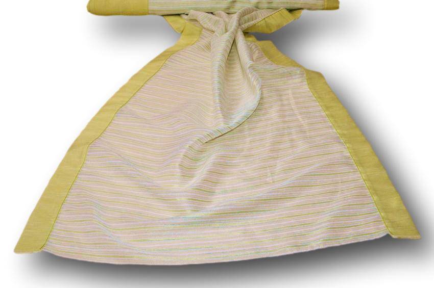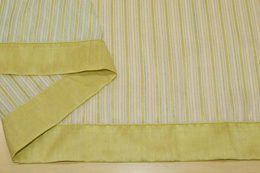 Tessuto tenda semi trasparente con bordo verde sui lati. Da orlare solo sopra e sotto. Idoneo per realizzare tendine a vetro.