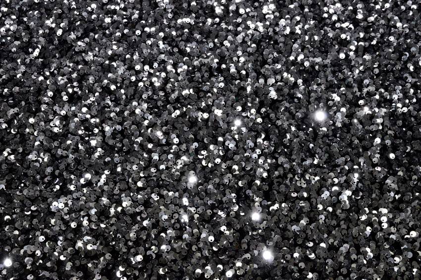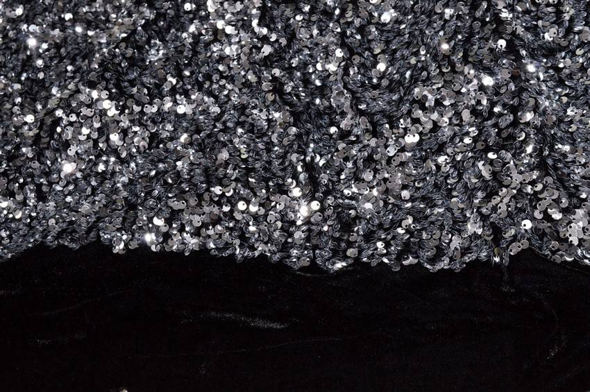 Tessuto dalla mano morbida e pesante. Presenta un fondo nero in ciniglia con paillettes decorative cucite di diametro 5 mm. Idoneo per realizzare top, abiti da sera ed abbigliamento elegante vario.