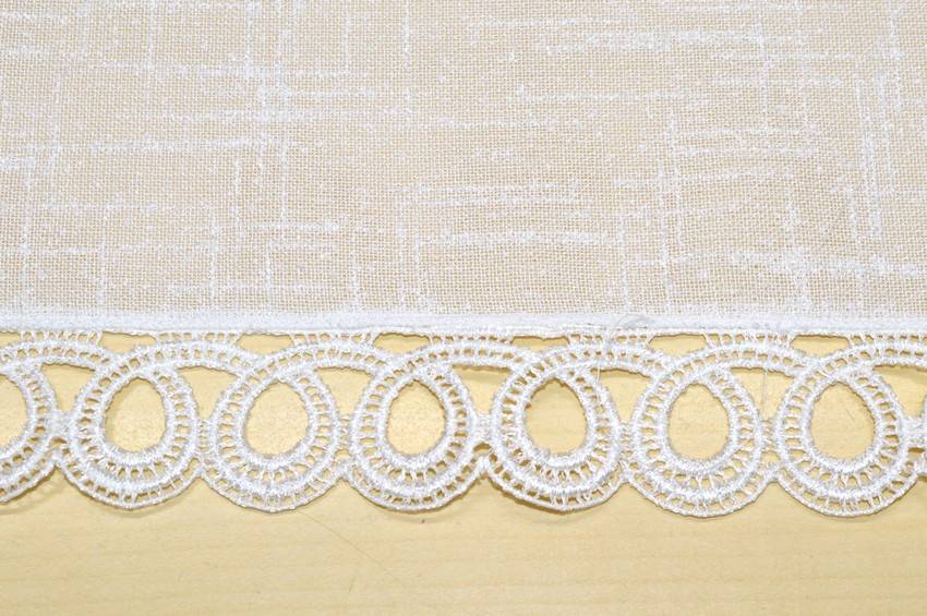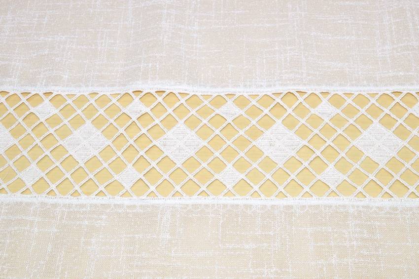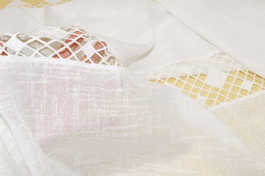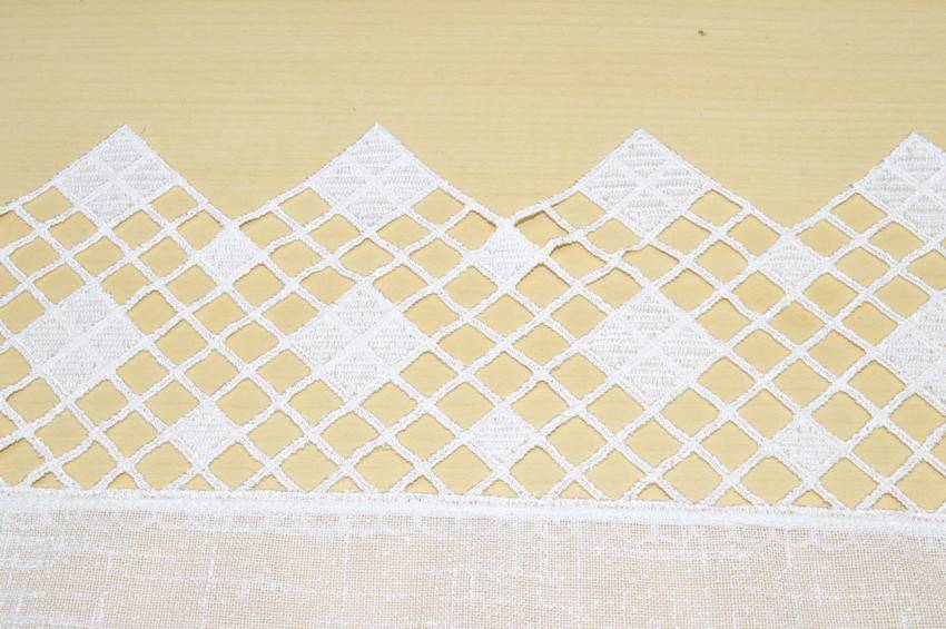 Splendido tessuto tirolese semitrasparente di fondo bianco con effetto lino. La stoffa viene arricchita dagli incassi in pizzo macrame posti alle estremità e al centro.