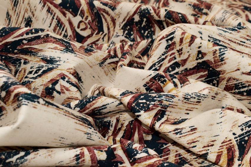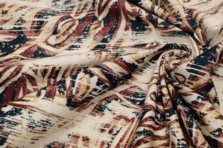 Tessuto di fondo beige in cotone elasticizzato. Viene particolarizzato dalla stampa astratta che unisce armoniosamentre tra loro le colorazioni dei dettagli blu, rosso e giallo. Di medio peso è ideale per realizzare pantaloni, gonne, abiti e giacche di mezza stagione.