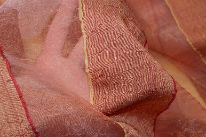 Tessuto per tende in organza semi-trasparente e filtrante alla luce donando alla stanza luminosità. Il fondo viene vivacizzato dalle bande color salmone, impreziosite da sottili striature gialle e rosse. Ideale per realizzare allegre tende arricciate.
