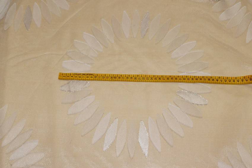 Tessuto per tende in organza filtrante alla luce e di struttura sostenuta. L'elegante fondo chiaro viene decorato da intarsi atti a ricreare dei petali color bianco, avorio e argento. I fiori hanno un diametro di cm 39. Prezioso e delicato è perfetto per realizzare ogni tipo di tende arricciate.