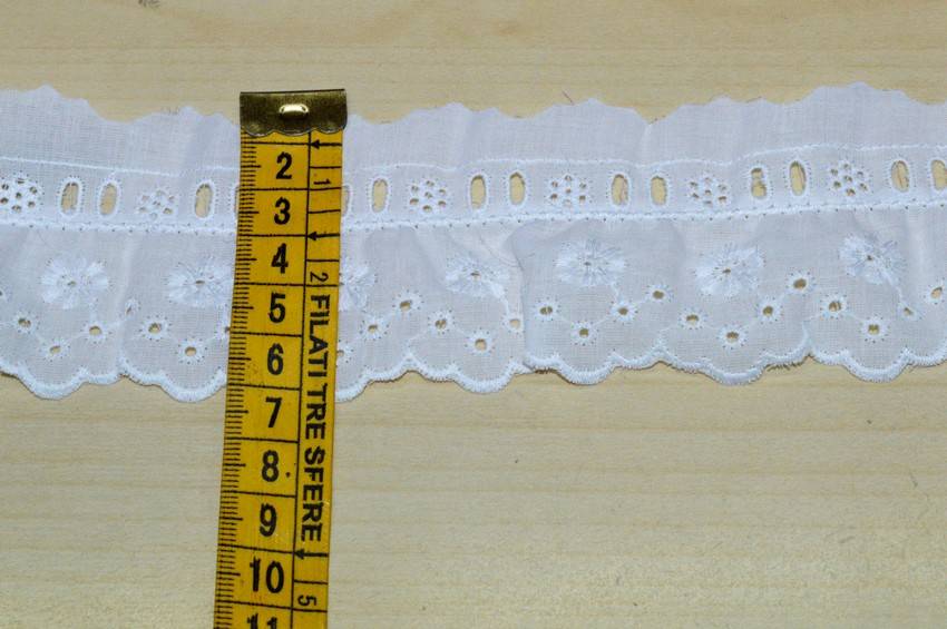 Pizzo san gallo arricciato in puro cotone bianco di altezza cm 6. Ideale per applicazioni su lenzuolini, capi d'abbigliamento e lavori di cucito creativo vario.