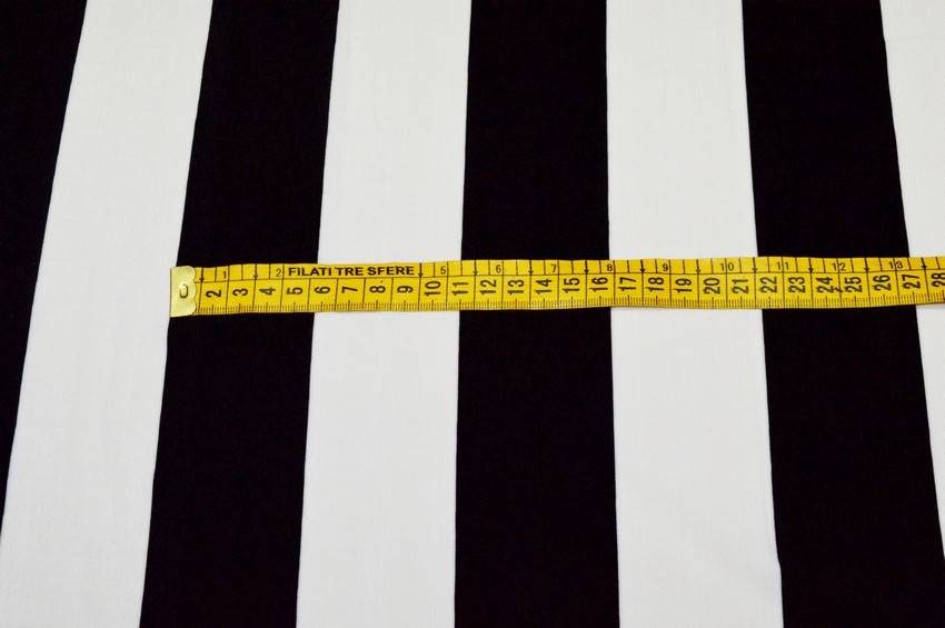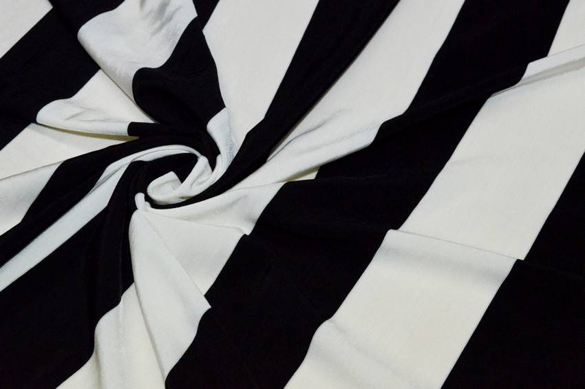 Tessuto in viscosa dalla mano molto scivolosa, cadente e bi-elastica. Il fondo ha un finish lucido e viene abbellito dalla fantasia rigata bianco/nera di cm 5.5