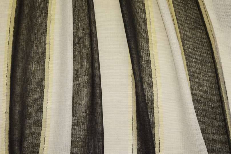Tessuto idoneo per tendaggi di mano leggera e cadente unita ad un aspetto luminoso e filtrante alla luce, ottimale per arredare l'ambiente senza rinunciare all'illuminazione della stanza. Il fondo presenta una fantasia rigata composta fa irregolari fasce nere e color sabbia/beige chiaro (non bianco, non panna). Perfetto per la confezione di tende arricciate.