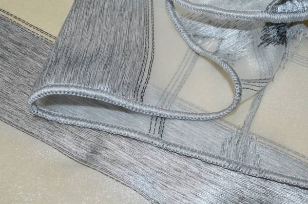 Splendido tessuto per tende dal fondo grigio semitrasparente. La base viene decorata da fasce grigie con striature bianche. Vi sono inoltre applicazioni geometriche grigie e nere su tutta la lunghezza della stoffa. Ottimale per realizzare tende arricciate di ogni tipologia.