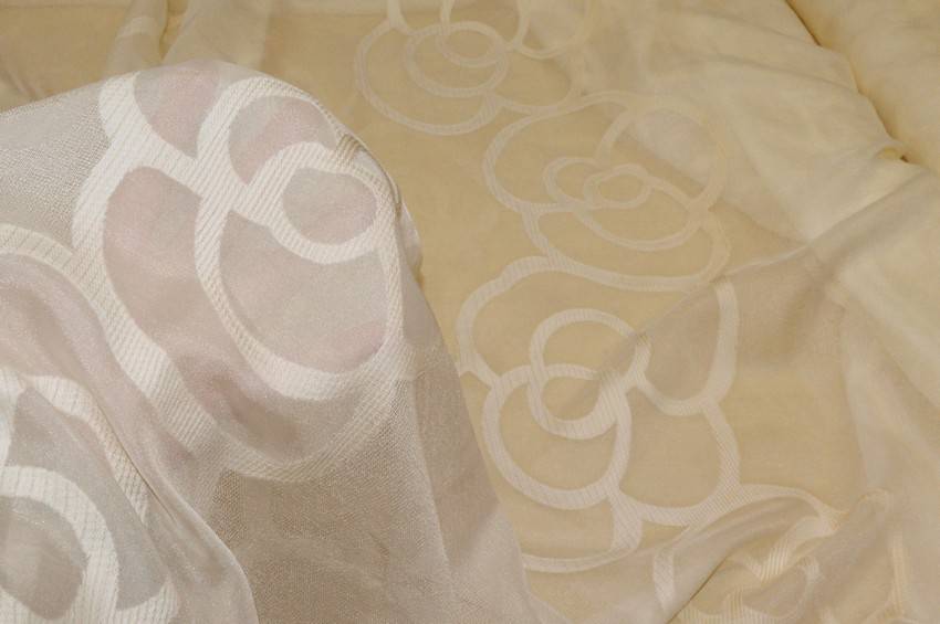 Tessuto crepe per tende dalla mano leggera, cadente e semitrasparente. Il fondo panna viene decorato dall'applicazione floreale in tinta di 16 cm per un aspetto classico e raffinato. Idoneo per realizzare tutte le tipologie di tende arricciate.