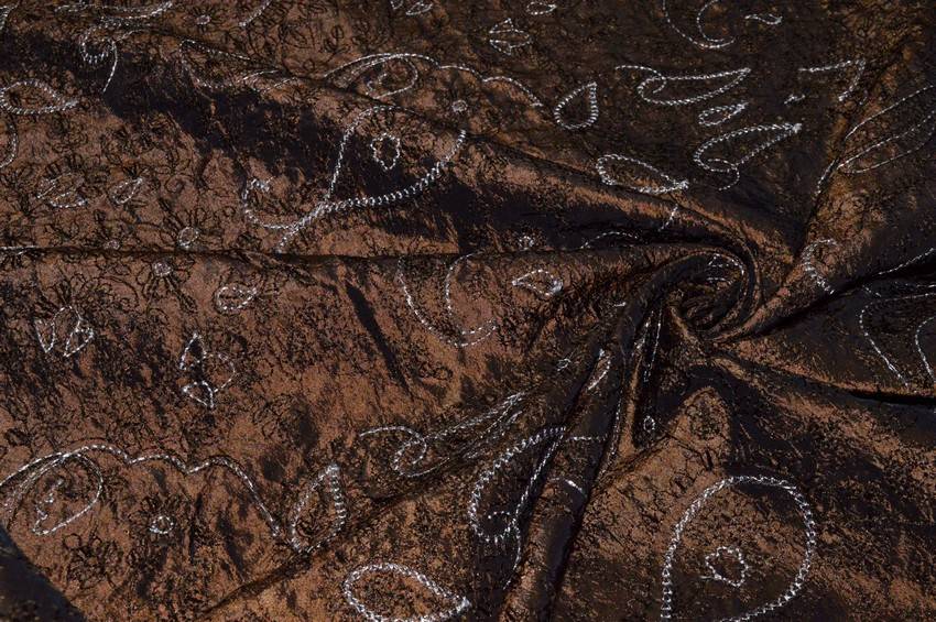 Tessuto taffetas dal fondo rame di mano rigida, sostenuta e coprente. La stoffa viene inoltre decorata da sottili ricami floreali bianchi ed in tinta. Idoneo per capi dai modelli voluminosi e piccoli lavori d'arredo come copricuscini.