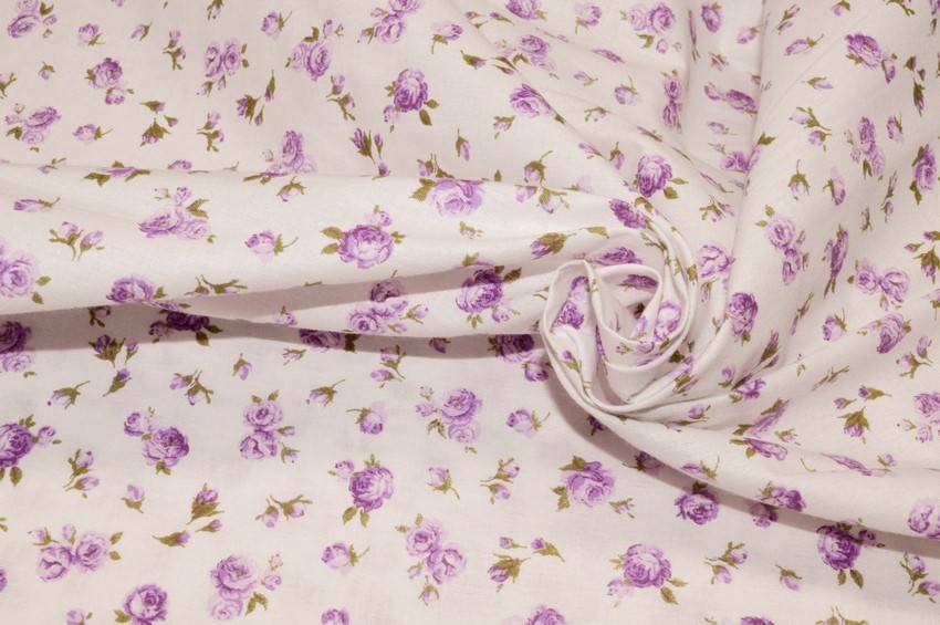 Tessuto in puro cotone dalla mano coprente e morbida. Il fondo bianco viene decorato dalla fantasia floreale lilla. Di pesantezza ideale per realizzare teli grandfoulard, rivestimento di cuscini, mantovane, lavori di cucito creativo, sacchi copripiumini e lenzuola.