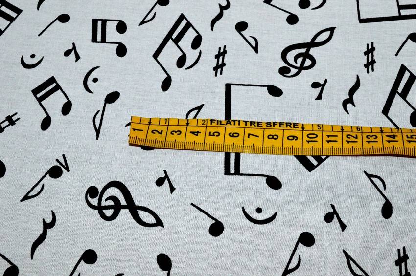 Tessuto in puro cotone di ottima qualità dalla mano morbida e confortevole. Il fondo bianco viene decorato da piccole note musicali nere di diverse forme. Simpatica e giocosa è la stoffa perfetta per creare piccoli lavori di arredo camerette come copricuscini e lenzuolini.