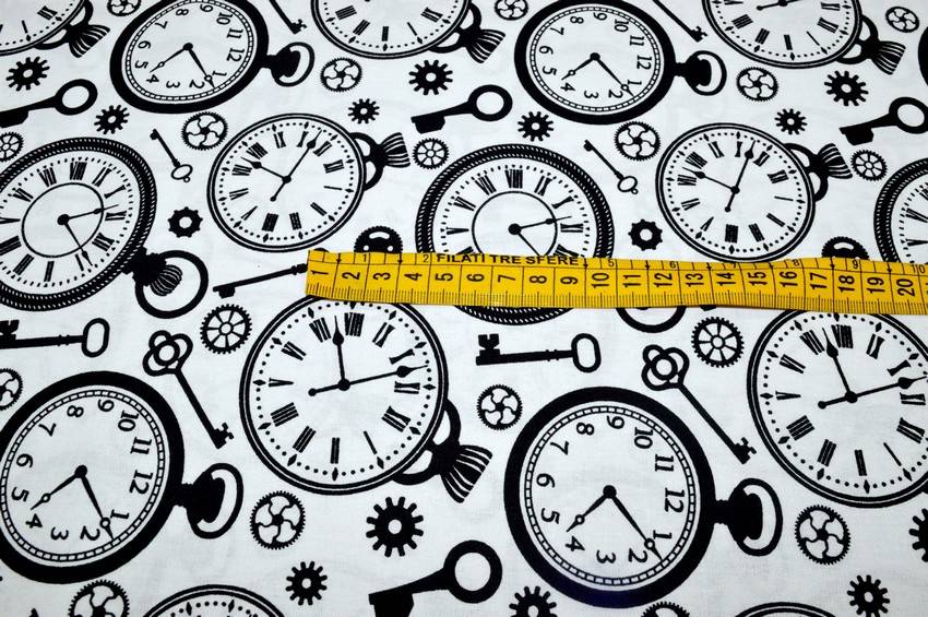 Vendita online ispirazioni fantasie cucito creativo tessuto puro cotone fantasia clocks bianca - Tessuti & Stoffe