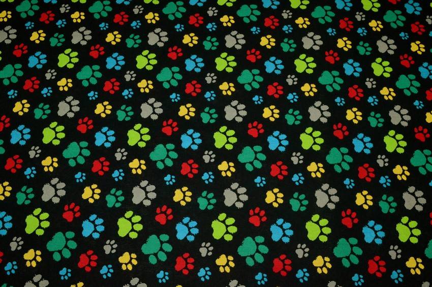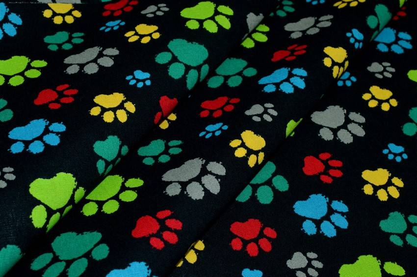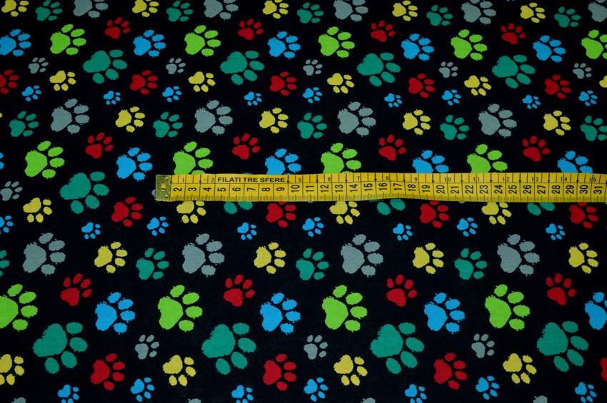Tessuto in puro cotone di ottima qualità dalla mano morbida e confortevole. Il fondo nero viene decorato da orme di diverse dimensioni e colori. Simpatica e giocosa è la stoffa perfetta per creare piccoli lavori di arredo camerette come copricuscini e lenzuolini.