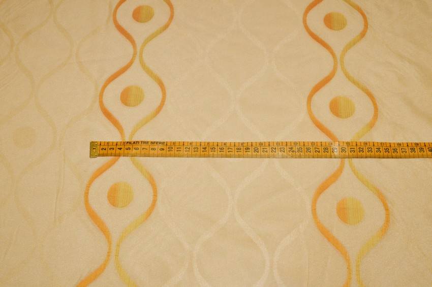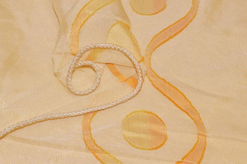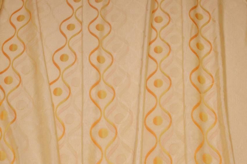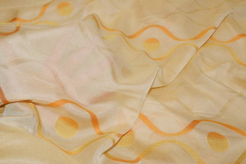 Tessuto per tende di fondo crepe color crema, morbido, leggero e cadente al tatto. La base semicoprente viene inoltre arricchita da luminosi dettagli in fill coupé arancio. Idoneo per realizzare tutti i tipi di tende arricciate.