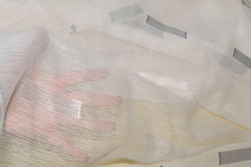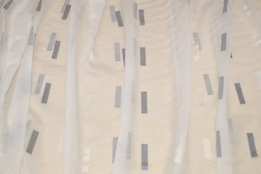 Tessuto per tende trasparente e leggero di fondo bianco con applicazioni geometriche in fill coupé blu e bianche. Filtrante e luminoso è perfetto per arredare l'ambiente realizzando tende arricciate di ogni tipologia.