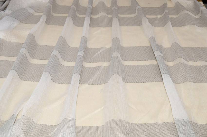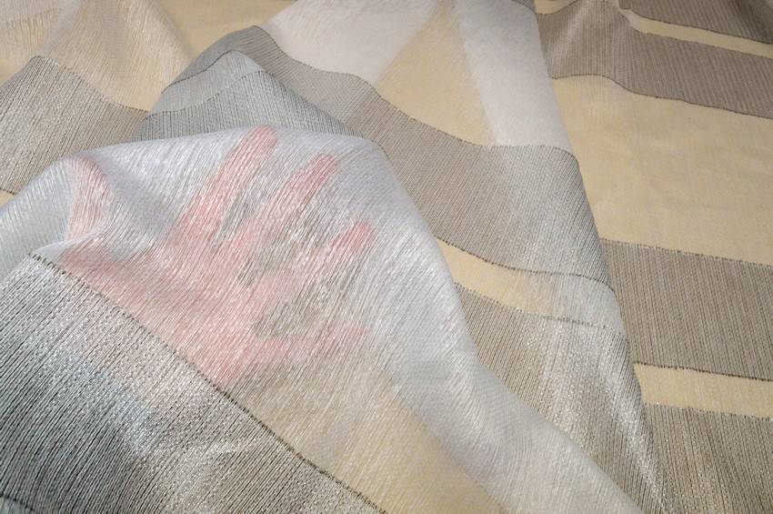 Tessuto per tende di fondo bianco morbido, legggero e filtrante alla luce. Le righe orizzontali grigie donano un aspetto moderno e minimal alla stoffa. Ideale per abbellire l'ambiente realizzando tende arricciate di ogni tipo.