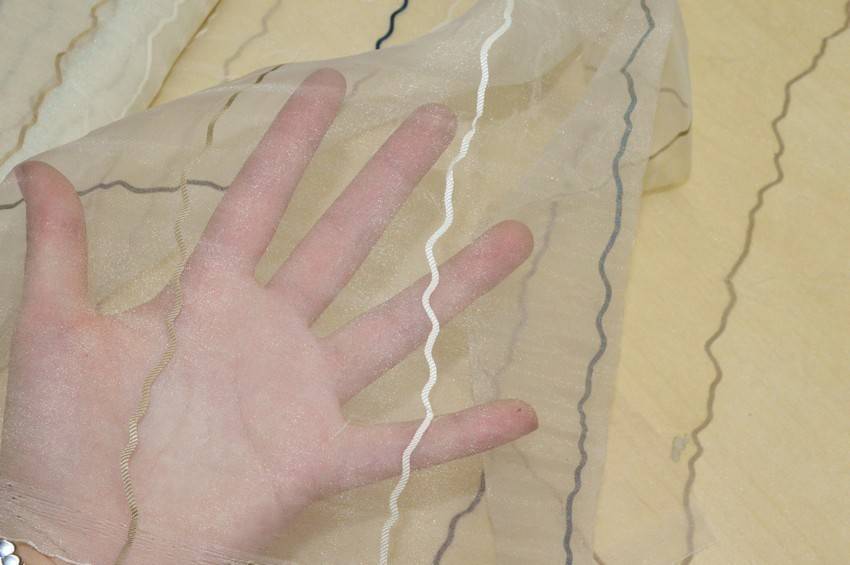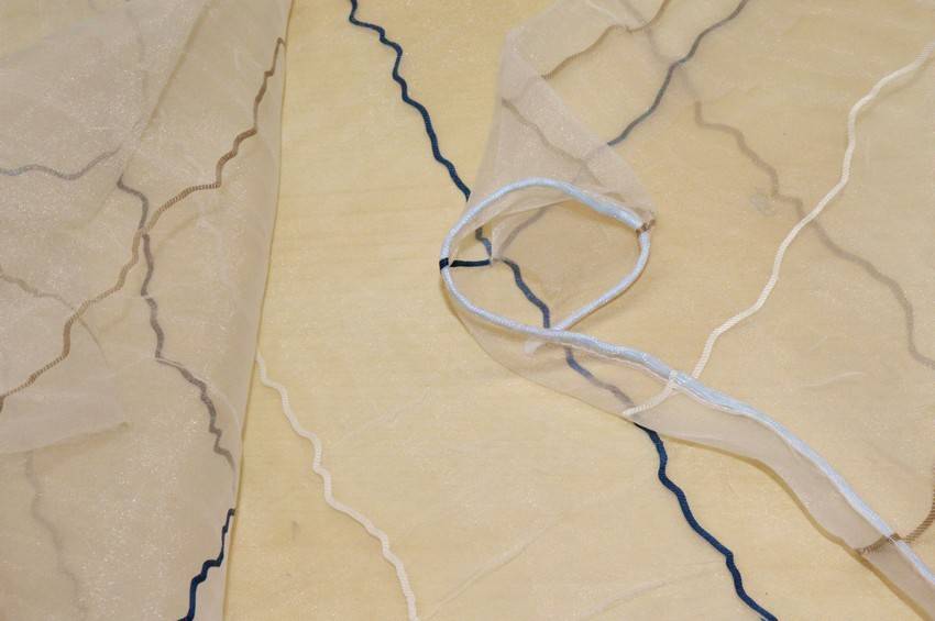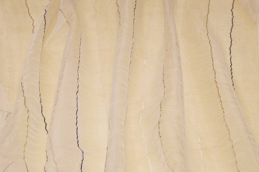 Tessuto per tende in organza trasparente di mano leggera e filtrante alla luce. Il fondo viene inoltre decorato da sottili linee irregolari beige, panna e blu su tutta la lunghezza. Idoneo per realizzare tutti i tipi di tende arricciate.