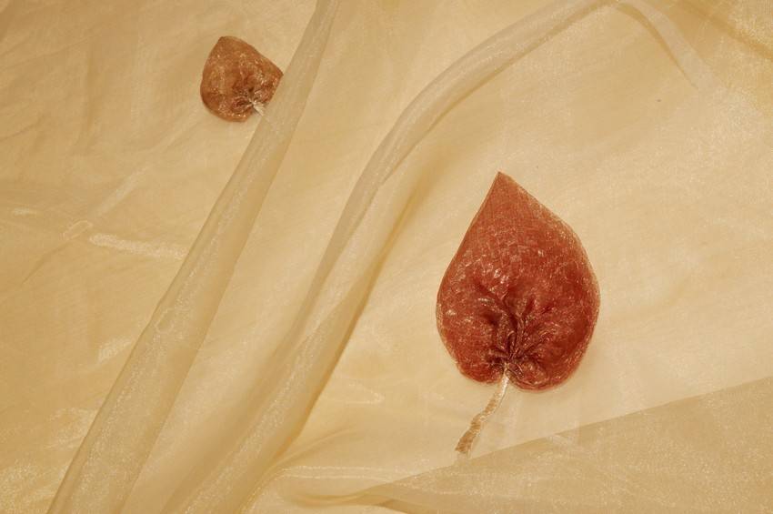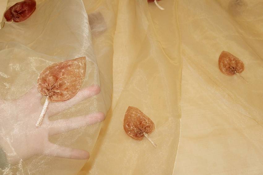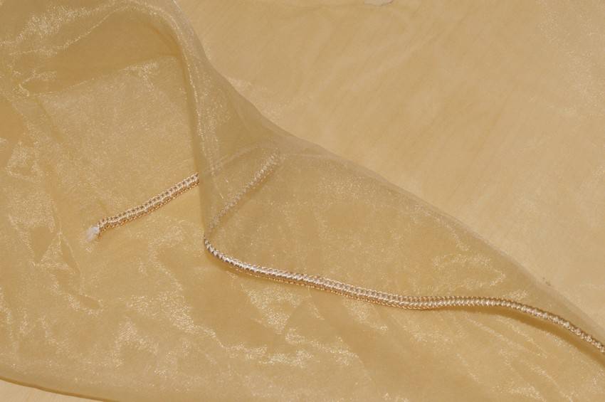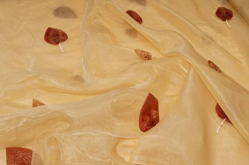 Tessuto per tende in organza trasparente, leggero e cadente. Il fondo giallo/oro viene decorato da foglie in tessuto ricamate di diverse dimensioni. Idoneo per realizzare tutte le tipologie di tende arricciate.