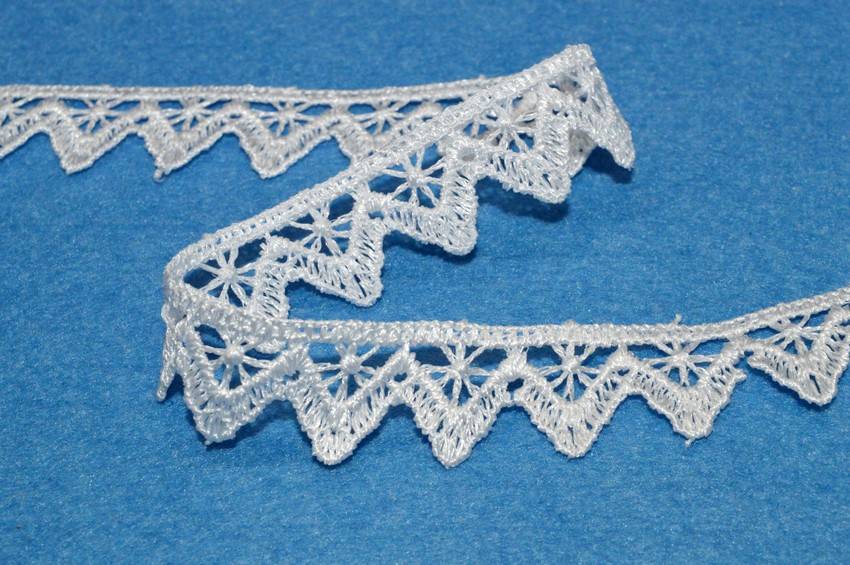 Pizzo bianco alto 1.5 cm. Ottimo per abbellire i propri lavori di cucito creativo e per arricchire articoli di biancheria per la casa come strofinacci, asciugamani e lenzuola. Utilizzato anche per per rifinire capi d'abbigliamento.