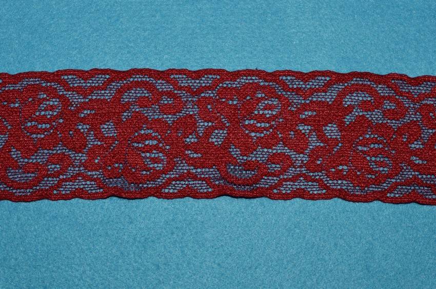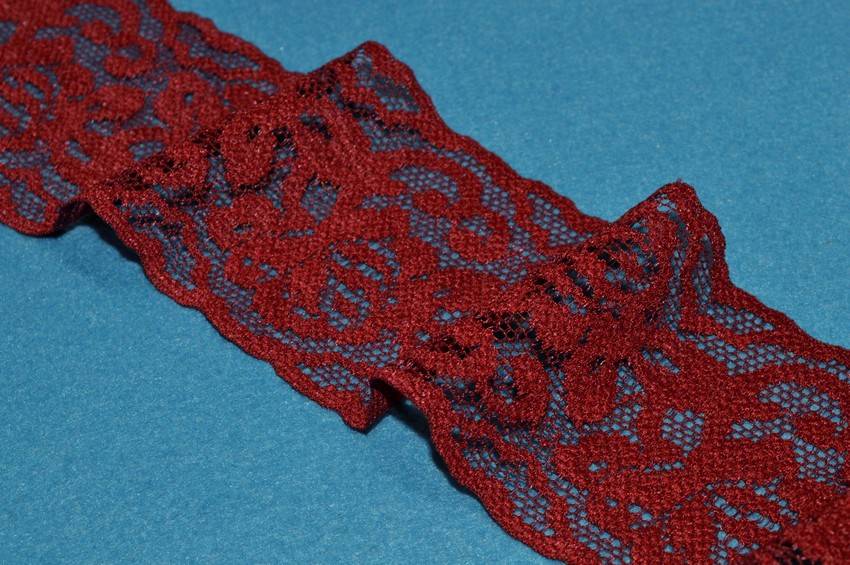 Pizzo rosso elasticizzato alto 6 cm. Ottimo per rifinire capi d'abbigliamento.