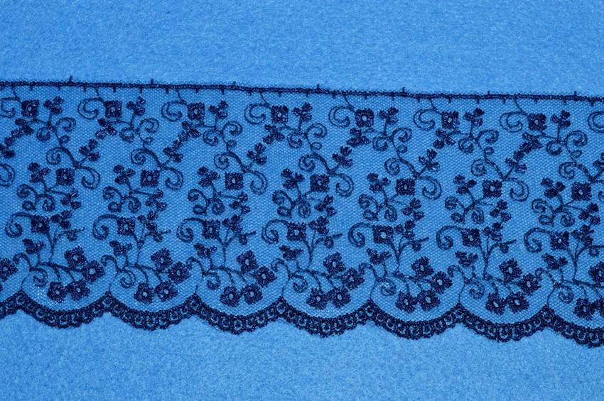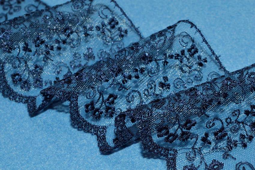 Tulle ricamato blu alto 7 cm. Ottimo per abbellire i propri lavori di cucito creativo e per arricchire articoli di biancheria per la casa come strofinacci, asciugamani e lenzuola. Utilizzato anche per per rifinire capi d'abbigliamento.