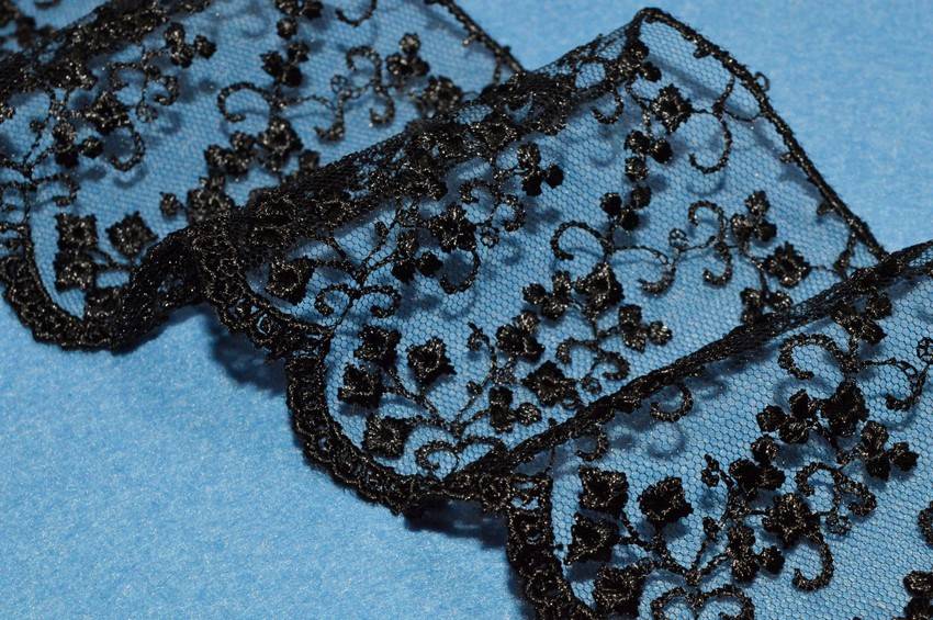 Tulle ricamato nero alto 7 cm. Ottimo per abbellire i propri lavori di cucito creativo e per arricchire articoli di biancheria per la casa come strofinacci, asciugamani e lenzuola. Utilizzato anche per per rifinire capi d'abbigliamento.