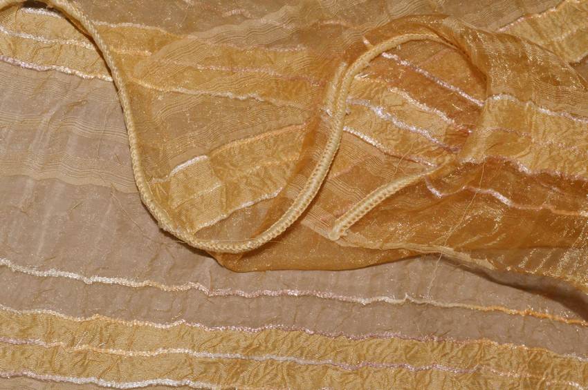 Tessuto per tende in organza dorata semitrasparente di mano leggera, cadente e filtrante alla luce. Il fondo viene inoltre decorato da linee irregolari di diversa larghezza donando movimento alla stoffa. Idoneo per realizzare tutti i tipi di tende arricciate.