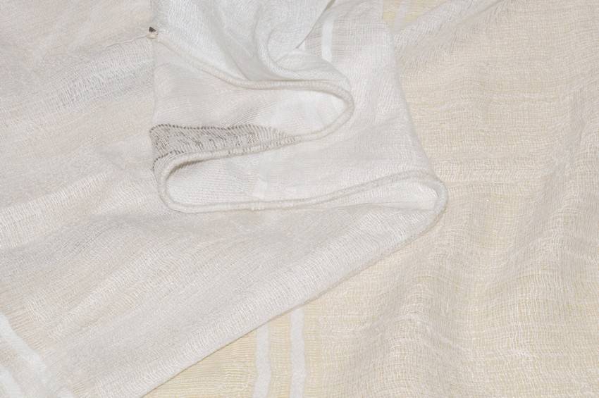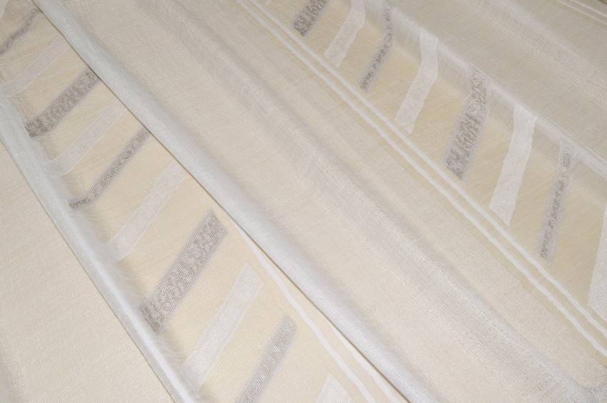 Il fondo color bianco naturale (non bianco ottico, non panna) viene impreziosito dalle applicazioni geometriche in tono e da eleganti dettagli color tortora.