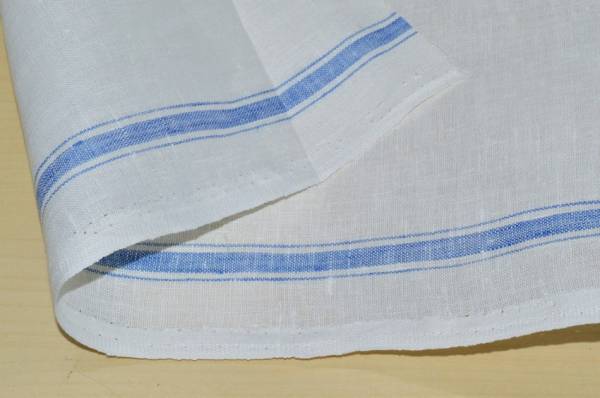 Ottimo tessuto in puro lino per strofinacci con fondo bianco decorato da piccole linee laterali colorate.