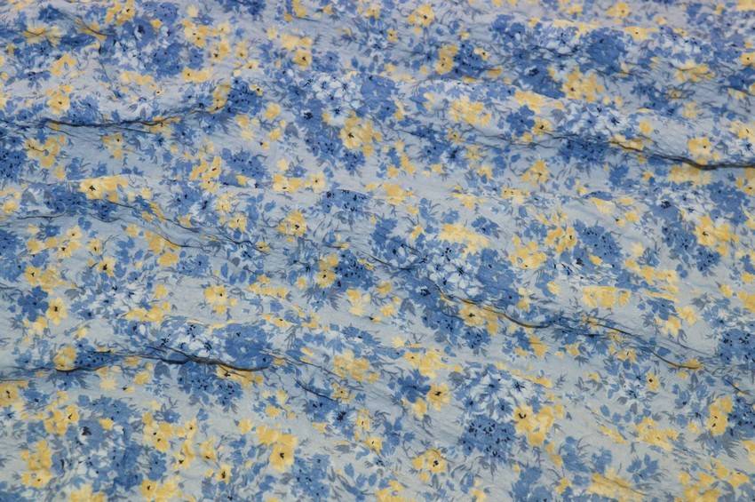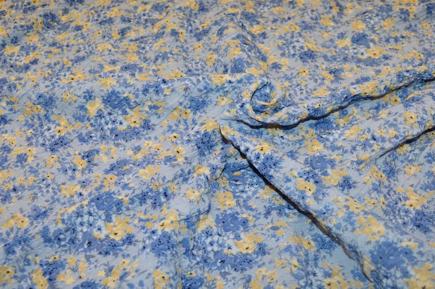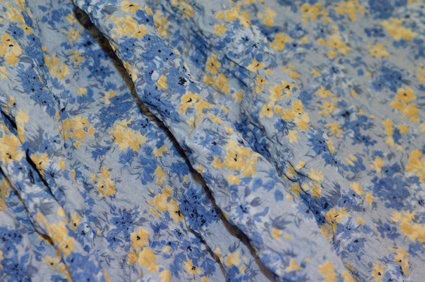 Tessuto di mano leggera abbellito dal fondo goffrato che conferisce alla stoffa un effetto lievemente tridimensionale. La base azzurra viene inoltre vivacizzata dai piccoli e graziosi fiori gialli. Può essere utilizzato per realizzare splendidi capi d'abbigliamento vario come top, camicie ed abitini estivi.