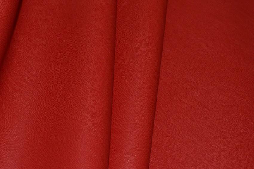 Tessuto di finta pelle rossa leggermente elasticizzata, idonea per realizzare abbigliamento vario come pantaloni, gilet, giacche e gonne.