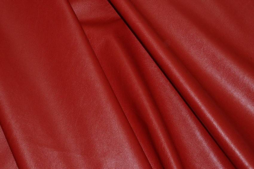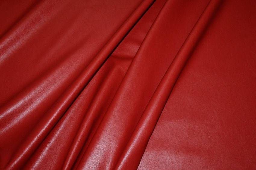 Tessuto di finta pelle rossa leggermente elasticizzata, idonea per realizzare abbigliamento vario come pantaloni, gilet, giacche e gonne.