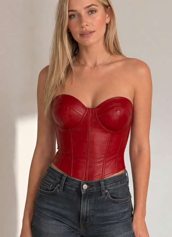 Tessuto di finta pelle rossa leggermente elasticizzata, idonea per realizzare abbigliamento vario come pantaloni, gilet, giacche e gonne.