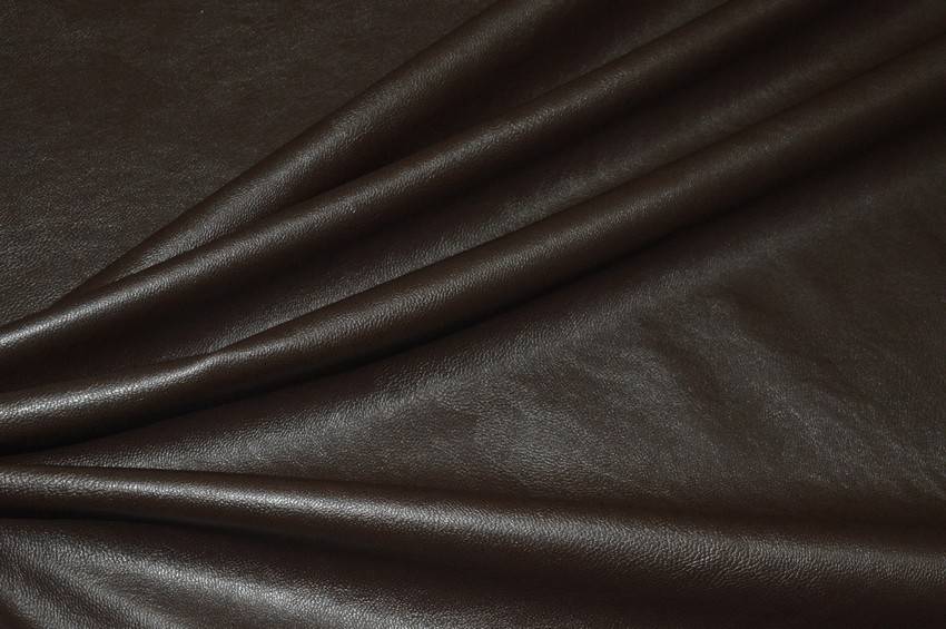 Tessuto di finta pelle marrone leggermente elasticizzata, idonea per realizzare abbigliamento vario come pantaloni, gilet, giacche e gonne.